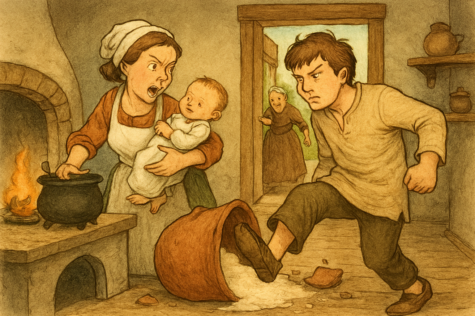 Then the wife left something on the stove and the baby is unattended. Then the husband ( lazy person) finds the baby unattended and picks the baby up then goes to the wife.The husband was so angry that he kicked the wife. But then something broke.